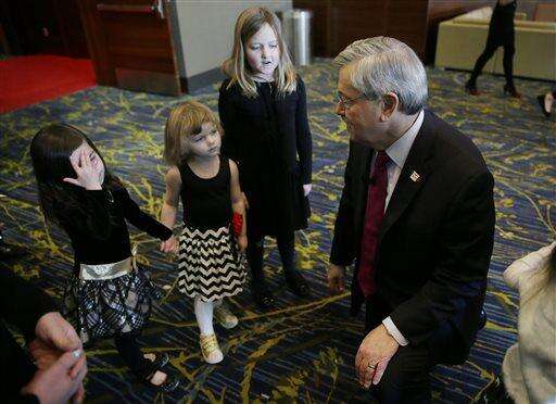 Iowa Gov. Terry Branstad, right, talks with his granddaughters after taking the oath of office during inauguration ceremonies, Friday, Jan. 16, 2015, in Des Moines, Iowa. (AP Photo/Charlie Neibergall)