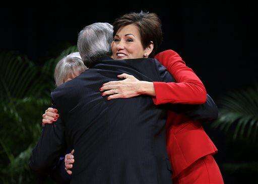 Iowa Lt. Gov. Kim Reynolds, left, gets a hug from Iowa Gov. Terry Branstad after taking the oath of office during inauguration ceremonies, Friday, Jan. 16, 2015, in Des Moines, Iowa. (AP Photo/Charlie Neibergall)