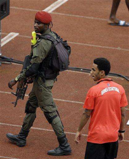 A security officer walks past an Equatorial Guinea player during their stadium visit ahead of the opening African Cup of Nations Group A soccer match in Bata, Equatorial Guinea, Friday Jan. 16, 2015. (AP Photo/Themba Hadebe) The Associated Press