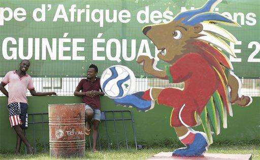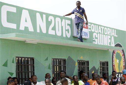 Unidentified men stand outside a ticketing office ahead of the opening African Cup of Nations Group A soccer match in Bata, Equatorial Guinea, Friday Jan. 16, 2015. (AP Photo/Themba Hadebe) The Associated Press