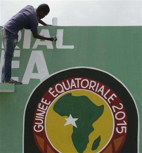 A man paints letters ahead of Saturday's opening African Cup of Nations Group A soccer match in Bata, Equatorial Guinea, Friday Jan. 16, 2015. (AP Photo/Themba Hadebe) The Associated Press