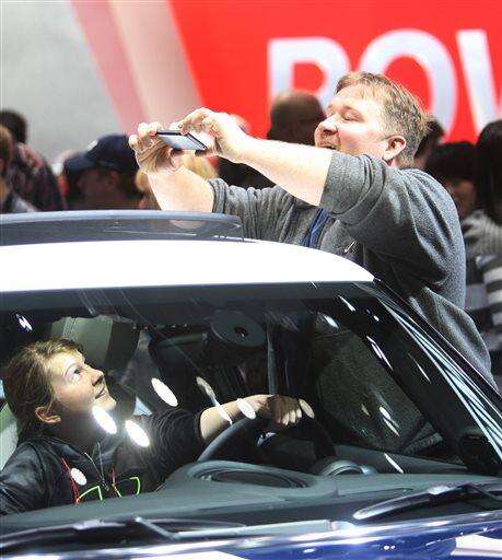 Donivan Navock takes a picture of his daughter Veronica Navock in a Mini Cooper S Hard Top at the North American International Auto Show at Cobo Center in downtown Detroit on Saturday, Jan. 17, 2015 in Detroit. Saturday was the first day the show was open to the public. It runs through Jan. 25. (AP Photo/Detroit Free Press, Kirthmon F. Dozier)