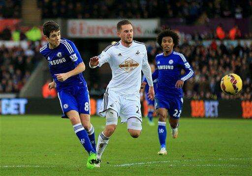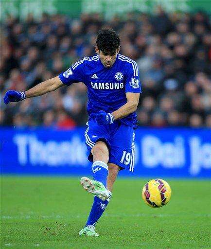 Diego Costa and Oscar both scored twice before Andre Schuerrle completed Swansea's home humiliation, to go provisionally five points ahead of Manchester City, which hosts Arsenal on Sunday.