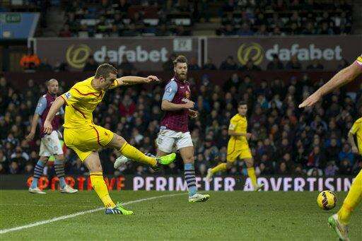Liverpool's Rickie Lambert, left, scores during the English Premier League soccer match between Aston Villa and Liverpool at Villa Park Stadium, Birmingham, England, Saturday Jan. 17, 2015. (AP Photo/Jon Super) The Associated Press