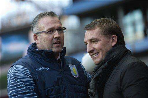 Aston Villa's manager Paul Lambert, left, greets Liverpool's manager Brendan Rodgers before the English Premier League soccer match between Aston Villa and Liverpool at Villa Park Stadium, Birmingham, England, Saturday Jan. 17, 2015. (AP Photo/Jon Super) The Associated Press