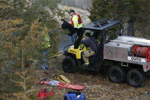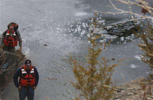 Rescue workers look for two juveniles who fell through the ice at a quarry Sunday, Jan. 18, 2015, in Spencer, Ind. The teenagers were taken in separate ambulances to IU Health Bloomington Hospital. Updates on their conditions were not immediately available. (AP Photo/Bloomington Herald-Times, Jeremy Hogan)