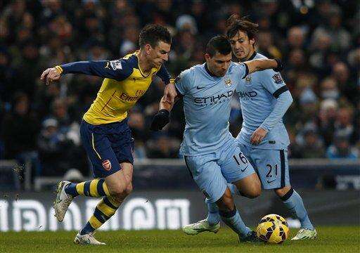 Manchester City's Sergio Aguero, right, takes the ball past Arsenal's Laurent Koscielny during the English Premier League soccer match between Manchester City and Arsenal at the Etihad Stadium, Manchester, England, Sunday, Jan. 18, 2015. (AP Photo/Jon Super)