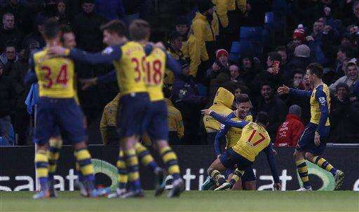 MANCHESTER, England (AP) - Arsenal finally ended its streak of poor away performances against top teams as Santi Cazorla and Olivier Giroud scored in each half Sunday for a 2-0 victory at Manchester City.