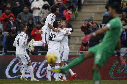 Real Madrid's Cristiano Ronaldo, third right, celebrates his goal with team mates during a Spanish La Liga soccer match between Getafe and Real Madrid at the Coliseum Alfonso Perez stadium in Madrid, Spain, Sunday, Jan. 18, 2015. (AP Photo/Andres Kudacki) The Associated Press