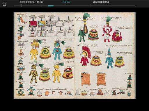 This image made from the screen of a mobile device on Thursday, Jan. 15, 2015 shows the The Codex Mendoza app with a page from the 16th century document that is considered one of the most important primary sources on the Aztecs of pre-Columbian Mexico. The interactive document, released on Thursday by Mexico's National Institute of Anthropology (INAH), lets users mouse-over the old Spanish text for translations into English or modern Spanish, and click on images for richer explanations and explore maps of the area. The original was compiled by Aztec and Spanish artisans to inform the king of Spain about conditions in the viceroyalty. (AP Photo)
