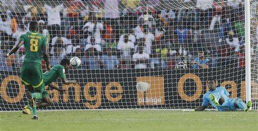 Senegal's Mame Birame Diouf, second from left, scores a goal against Ghana's goalkeeper Razak Braimah, right, during the African Cup of Nations Group C soccer match between Ghana and Senegal in Mongomo, Equatorial Guinea, Monday, Jan. 19, 2015. (AP Photo/Themba Hadebe) The Associated Press