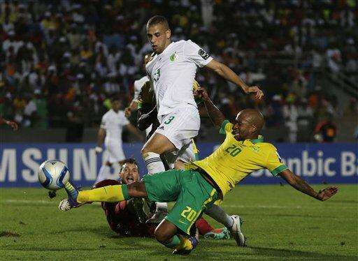 South Africa's Oupa Manyisa, right, and Algeria's Islam Slimani challenge for the ball, during the African Cup of Nations Group C soccer match between Algeria and South Africa in Mongomo, Equatorial Guinea, Monday, Jan. 19, 2015. (AP Photo/Themba Hadebe) The Associated Press