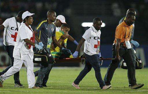 South Africa's Rivaldo Coetzee, is carried out of the field on a stretcher during the African Cup of Nations Group C soccer match against Algeria in Mongomo, Equatorial Guinea, Monday, Jan. 19, 2015. (AP Photo/Themba Hadebe) The Associated Press