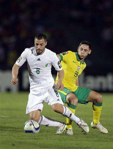 Algeria's Yacine Brahimi, right, is challenged by South Africa's Dean Furman, during the African Cup of Nations Group C soccer match between Algeria and South Africa in Mongomo, Equatorial Guinea, Monday, Jan. 19, 2015. (AP Photo/Themba Hadebe) The Associated Press