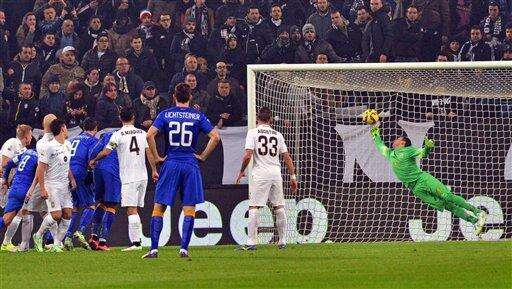 Verona goalie Rafael fails to stop a free-kick for Juventus forward Sebastian Giovinco to score his side's first goal, during an Italian Cup, round of sixteen soccer match between Juventus and Verona at the Turin Juventus stadium, Italy, Thursday, Jan. 15, 2015. (AP Photo/Andrea Di Marco, Ansa) The Associated Press