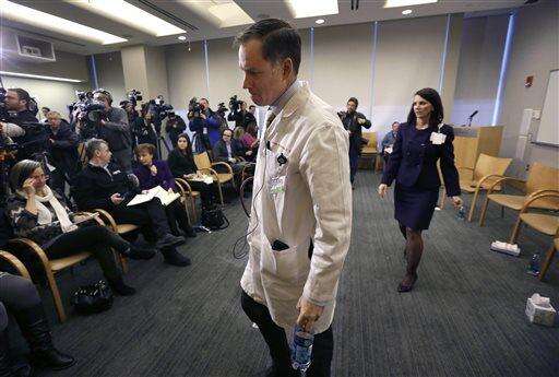 Brigham and Women's Hospital Primary Care Physician Charles Morris, center, walks past members of the media, left, following a news conference Wednesday, Jan. 21, 2015, during which Morris and fellow doctors shared memories of slain Cardiac Surgeon Michael J. Davidson at the hospital, in Boston. Officials at the hospital said Davidson died late Tuesday after being shot around 11 a.m. (AP Photo/Steven Senne)