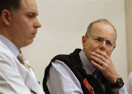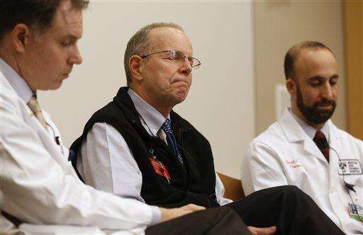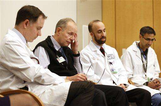 Brigham and Women's Hospital doctors, from the left, Primary Care Physician Charles Morris, Interventional Cardiologist Andrew Eisenhauer, and Thoracic Surgeon Daniel Wiener, appear emotional as they speak to members of the media Wednesday, Jan. 21, 2015, while remembering Michael J. Davidson, director of endovascular cardiac surgery during a news conference at the hospital, in Boston. Officials at the hospital said Davidson died late Tuesday after being fatally wounded around 11 a.m. by a gunman who then killed himself. (AP Photo/Steven Senne)