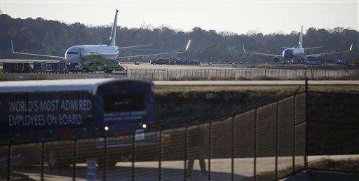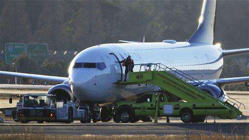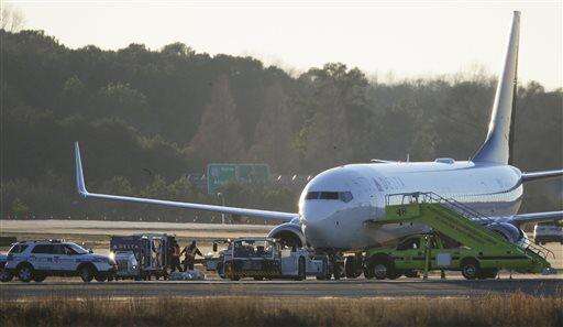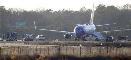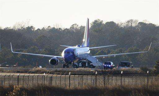 Law enforcement officials stand beneath a Southwest Airlines airplane on the tarmac at Hartsfield-Jackson Atlanta International Airport, Saturday, Jan. 24, 2015, in Atlanta. Police were searching two planes at Atlanta's main airport after authorities received what they described as "credible" bomb threats. (AP Photo/David Goldman)