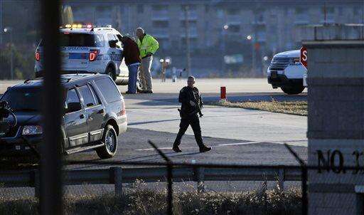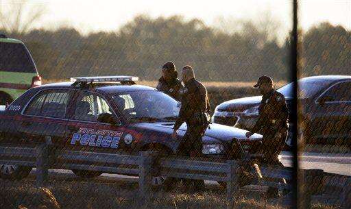 Police officers leave a fire station off the tarmac at at Hartsfield-Jackson Atlanta International Airport where two airplanes were being searched after authorities received what they described as "credible" bomb threats, Saturday, Jan. 24, 2015, in Atlanta. (AP Photo/David Goldman)