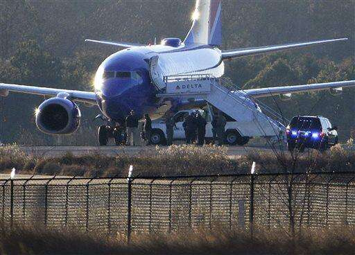 Workers unload cargo from a Delta Airlines airplane sitting on the tarmac at Hartsfield-Jackson Atlanta International Airport, Saturday, Jan. 24, 2015, in Atlanta. Police were searching the Delta airplane and a Southwest airplane at Atlanta's main airport after authorities received what they described as credible bomb threats. (AP Photo/David Goldman)