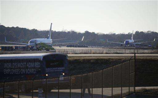 A Delta airplane at left and a Southwest airplane at right sit on the tarmac at Hartsfield-Jackson Atlanta International Airport, Saturday, Jan. 24, 2015, in Atlanta. Police were searching the two planes at Atlanta's main airport after authorities received what they described as "credible" bomb threats. (AP Photo/David Goldman)