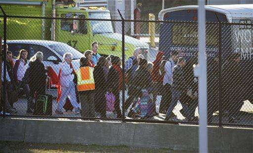 Passengers leave a fire station as they board a shuttle taking them off the tarmac at Hartsfield-Jackson Atlanta International Airport where two airplanes were being searched after authorities received what they described as credible bomb threats, Saturday, Jan. 24, 2015, in Atlanta. (AP Photo/David Goldman)