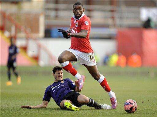 Bristol City's Jay Emmanuel-Thomas, top, and West Ham United's James Tomkins battle for the ball during the English FA Cup fourth round soccer match at Ashton Gate, Bristol, England, Sunday Jan. 25, 2015. (AP Photo/PA, Andrew Matthews) UNITED KINGDOM OUT NO SALES NO ARCHIVE The Associated Press