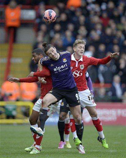 Bristol City's Mark Little, left, and George Saville battle for the ball West Ham United's Andy Carroll, center, battle for the ball during the English FA Cup fourth round soccer match at Ashton Gate, Bristol, England, Sunday Jan. 25, 2015. (AP Photo/PA, Andrew Matthews) UNITED KINGDOM OUT NO SALES NO ARCHIVE The Associated Press
