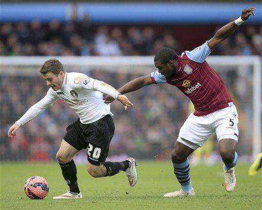 Aston Villa's Jores Okore, right, and Bournemouth's Ryan Fraser battle for the ball in the air during the English FA Cup fourth round soccer match at Villa Park, Birmingham, England, Sunday Jan. 25, 2015. (AP Photo/PA, Nick Potts) UNITED KINGDOM OUT NO SALES NO ARCHIVE The Associated Press