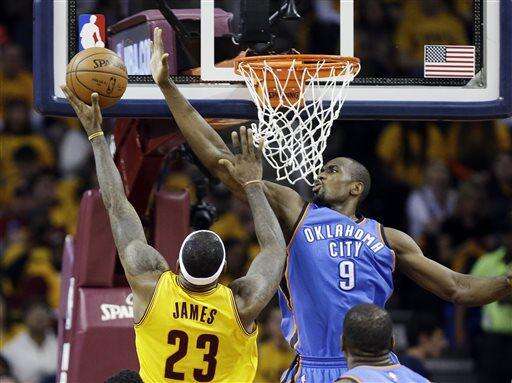 Oklahoma City Thunder's Serge Ibaka (9) goes up to block a shot by Cleveland Cavaliers' LeBron James (23) in the second quarter of an NBA basketball game Sunday, Jan. 25, 2015, in Cleveland. (AP Photo/Mark Duncan) The Associated Press