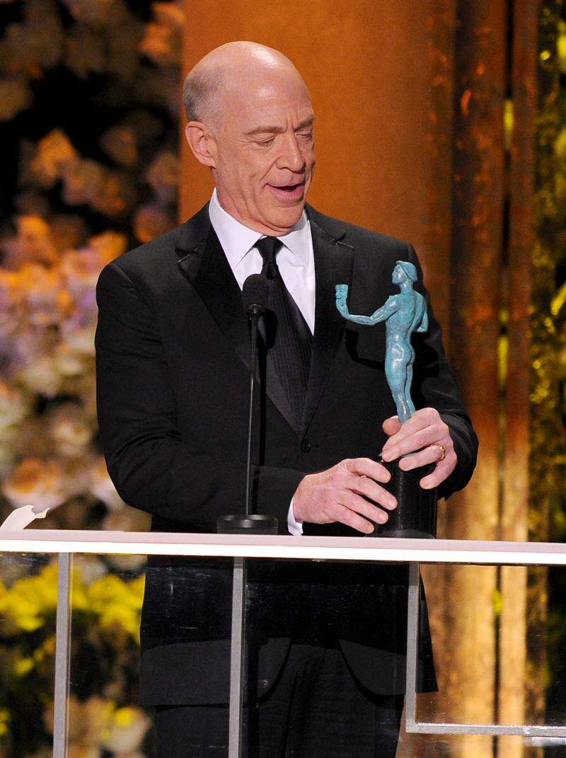 J.K. Simmons accepts the award for outstanding male actor in a supporting role for "Whiplash" on stage at the 21st annual Screen Actors Guild Awards.