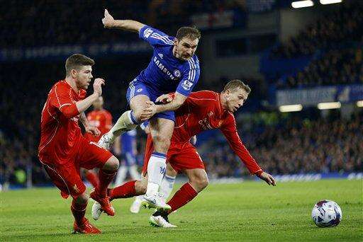 Chelsea's Branislav Ivanovic, center, battles for the ball between Liverpool's Alberto Moreno and Lucas Leiva, right, during the English League Cup semifinal second leg soccer match between Chelsea and Liverpool at Stamford Bridge stadium in London, Tuesday, Jan. 27, 2015. (AP Photo/Alastair Grant) The Associated Press