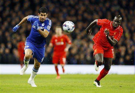 Liverpool's Mamadou Sakho, right, battles for the ball with Chelsea's Diego Costa during the English League Cup semifinal second leg soccer match between Chelsea and Liverpool at Stamford Bridge stadium in London, Tuesday, Jan. 27, 2015. (AP Photo/Kirsty Wigglesworth) The Associated Press