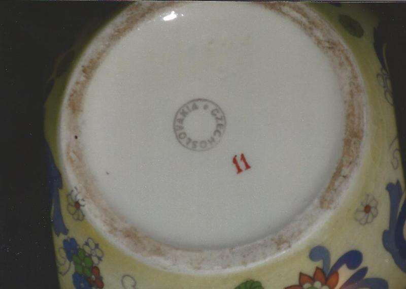 Q. This mark is on the bottom of an ironstone jug that I have. It was given to my mother by a neighbor. It stands about 7 inches tall and is decorated with blue and yellow flowers with green leaves against a cream background. Even though it has a handle, it is not a pitcher. It is in mint condition. I am interested in it because my ancestors came from Czechoslovakia.