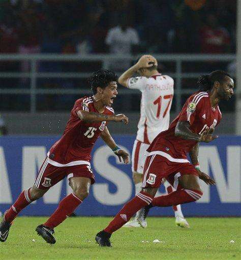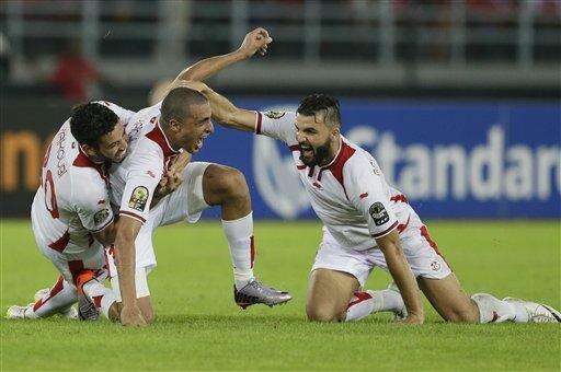 Tunisia's Ahmed Akaichi, center, celebrates his goal with teammates Houcine Ragued, left, and Syam Youssef, right, during their African Cup of Nations quarter final soccer match against Equatorial Guinea in Bata, Equatorial Guinea, Saturday, Jan. 31, 2015. (AP Photo/Themba Hadebe) The Associated Press
