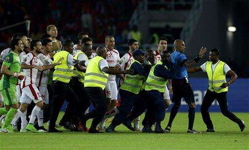 Referee Rajindraparsad Seechurn, second from right, is shielded by security personal against the Tunisia's players at the end of the African Cup of Nations quarter final soccer match against Equatorial Guinea in Bata, Equatorial Guinea, Saturday, Jan. 31, 2015. (AP Photo/Themba Hadebe) The Associated Press
