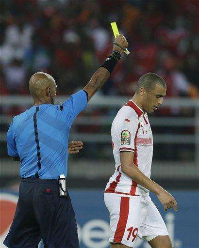 Tunisia's Ahmed Akaichi, left, is shown a yellow card by referee Rajindraparsad Seechurn, left, during their African Cup of Nations quarter final soccer match against Equatorial Guinea in Bata, Equatorial Guinea, Saturday, Jan. 31, 2015. (AP Photo/Themba Hadebe) The Associated Press