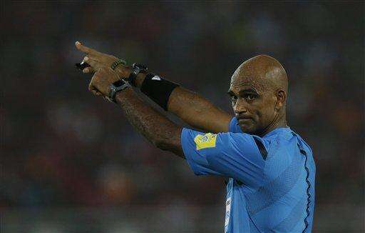 Referee Rajindraparsad Seechurn gestures during the African Cup of Nations quarter final soccer match between Equatorial Guinea and Tunisia in Bata, Equatorial Guinea, Saturday, Jan. 31, 2015. (AP Photo/Themba Hadebe) The Associated Press
