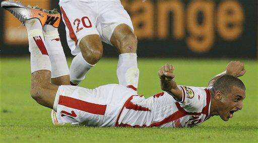 Tunisia's Ahmed Akaichi celebrates his goal during their African Cup of Nations quarter final soccer match against Equatorial Guinea in Bata, Equatorial Guinea, Saturday, Jan. 31, 2015. (AP Photo/Themba Hadebe) The Associated Press
