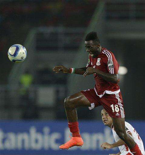 Equatorial Guinea's Viera Ellong Doualla, left, wins header against Tunisia's Wahbi Khazri, right, during their African Cup of Nations quarter final soccer match in Bata, Equatorial Guinea, Saturday, Jan. 31, 2015. (AP Photo/Themba Hadebe) The Associated Press