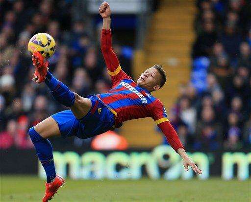 Crystal Palace's Dwight Gayle attempts an overhead shot at goal during their English Premier League soccer match against Everton at Selhurst Park, London, Saturday, Jan. 31, 2015. (AP Photo/Stephen Pond, PA Wire) UNITED KINGDOM OUT - NO SALES - NO ARCHIVES