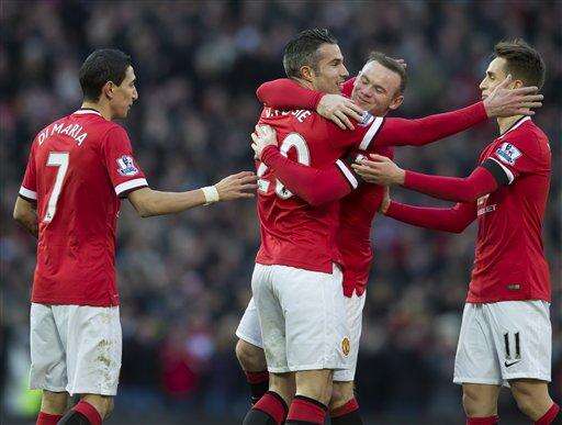 Manchester United's Robin van Persie, centre, left celebrates with teammates including Wayne Rooney, centre right, after scoring against Leicester during the English Premier League soccer match between Manchester United and Leicester at Old Trafford Stadium, Manchester, England, Saturday Jan. 31, 2015. (AP Photo/Jon Super)