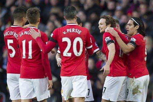 Manchester United's Daley Blind, center right, celebrates with teammates after forcing a Leicester own goal during the English Premier League soccer match between Manchester United and Leicester at Old Trafford Stadium, Manchester, England, Saturday Jan. 31, 2015. (AP Photo/Jon Super)