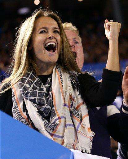 "I wish you a wonderful wedding and many kids," Djokovic said, kicking off his trophy acceptance speech. Murray smiled. His fiancee, Kim Sears, applauded from her seat in the crowd. She'd already drawn attention for her shirt that was emblazoned with the words "Parental Advisory Explicit Content" - a humorous reaction to being caught on camera apparently using expletives during Murray's semifinal.
