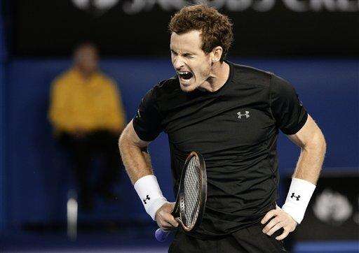 Andy Murray of Britain yells as he plays Novak Djokovic of Serbia during the men's singles final at the Australian Open tennis championship in Melbourne, Australia, Sunday, Feb. 1, 2015. (AP Photo/Bernat Armangue) The Associated Press