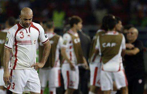Tunisia's Aymen Abdennour, left, dejected after loosing their African Cup of Nations quarter final soccer match against Equatorial Guinea in Bata, Equatorial Guinea, Saturday, Jan. 31, 2015. (AP Photo/Themba Hadebe) The Associated Press