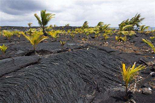 A new black sand beach was formed on the eastern shores of the Big Island after lava from the Kilauea volcano engulfed the town of Kalapana in 1990, destroying most of the homes. The molten lava also filled in Kaimu Bay, covered the beach that was there, and extended the shoreline, creating a new beach about a half-mile from the original. Locals began cultivating a grove of coconut trees at the new beach as soon as the lava cooled.