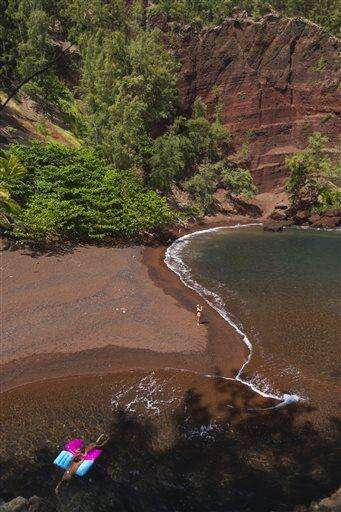Kaihalulu Bay on Maui near the town of Hana is home to a unique red sand beach. Towering red cinder cliffs surround the bay, and the blue ocean swirls along the red sandy shore. A large lava rock reef juts out in the bay slightly protecting the beach from harsh waves, but swimming is not advised. There are no lifeguards and ocean conditions are unpredictable.