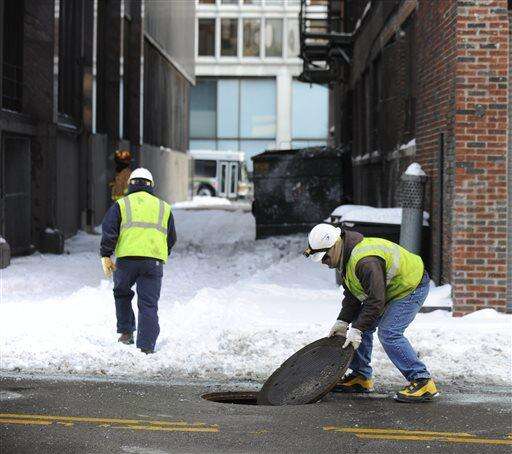 Detroit Fire Department and DTE workers respond to an explosion at the Fort Washington Plaza in Detroit on Tuesday, Feb. 3, 2015. Officials say an underground electrical problem sent three manhole covers into the air in downtown, prompting the evacuation of an office building. No injuries are reported. (AP Photo/Detroit News, David Coates) DETROIT FREE PRESS OUT; HUFFINGTON POST OUT The Associated Press
