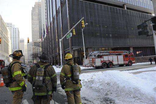 The Detroit Fire Department respond to an explosion at the Fort Washington Plaza in Detroit on Tuesday, Feb. 3, 2015. Officials say an underground electrical problem sent three manhole covers into the air in downtown, prompting the evacuation of an office building. No injuries are reported. (AP Photo/Detroit News, David Coates) DETROIT FREE PRESS OUT; HUFFINGTON POST OUT The Associated Press